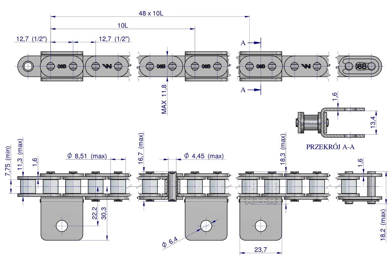 Łańcuch C08B (R1 1/2) przenośnika Kombajnu do Porzeczek 48 łopatek Waryński