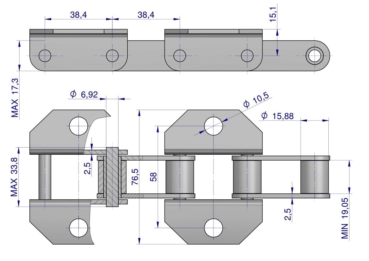 Łańcuch podajnika pochyłego 38.4R łapka K1 co 2 ogniwa 5m Waryński