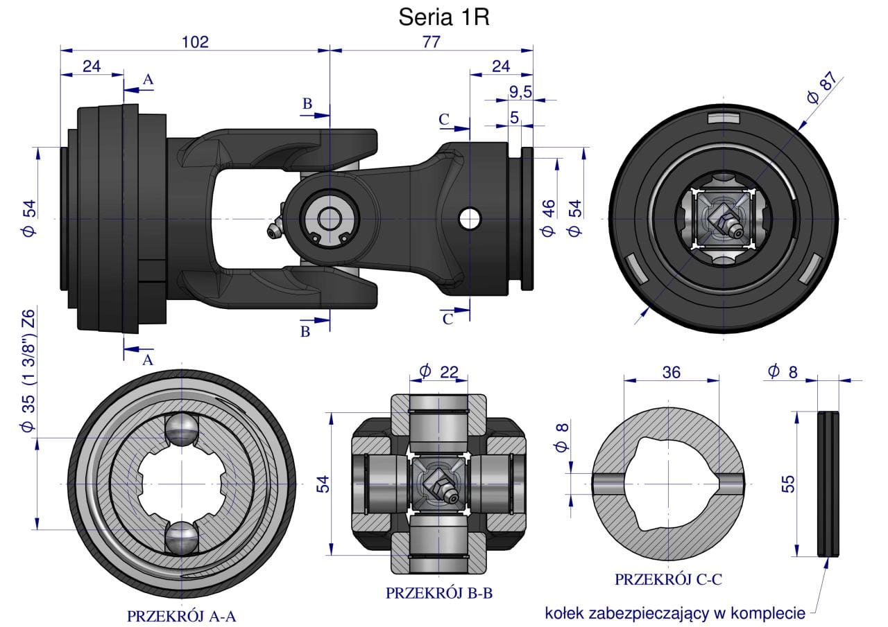 Przegub kompletny z krzyżakiem 22X54 seria 1 do rury zewnętrznej 36mm Waryński
