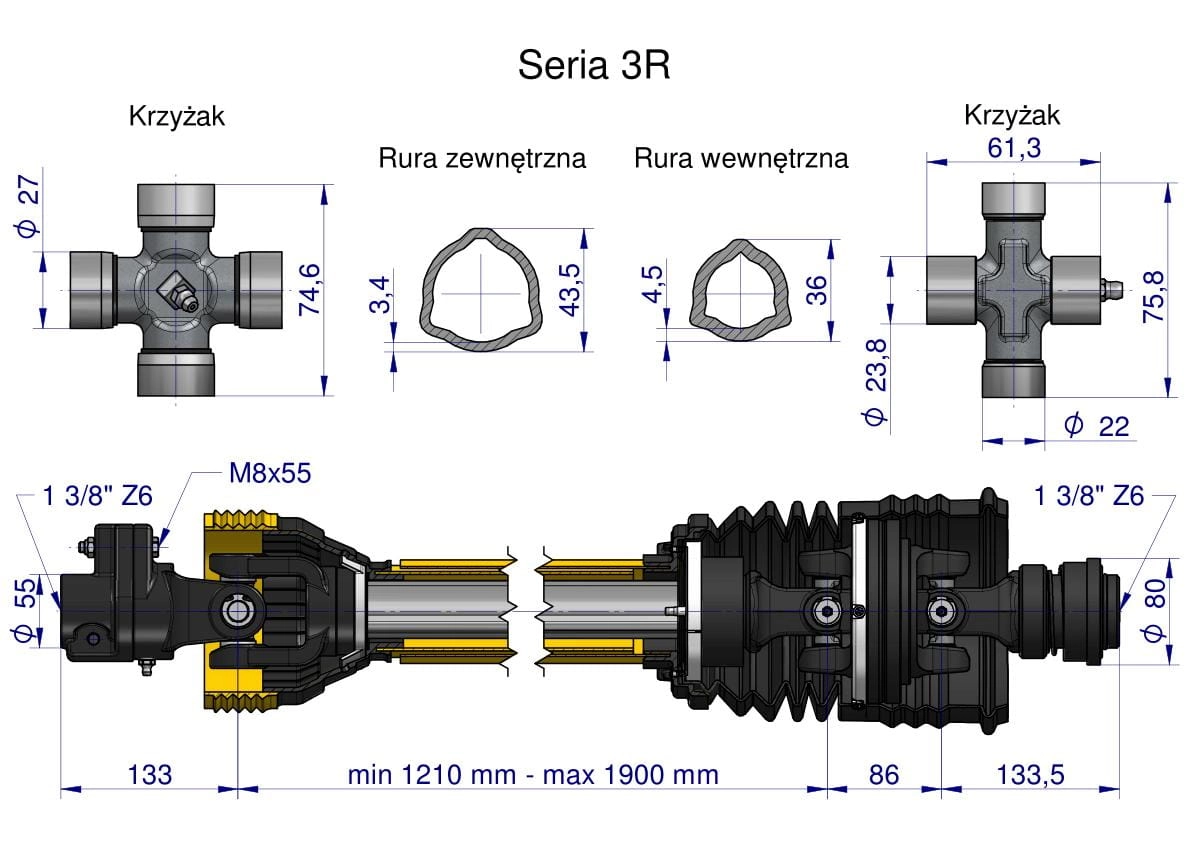 Wał przegubowo-teleskopowy 1210-1900mm 460Nm sprzęgło z kołkiem szerokokątny CE seria 3R WARYŃSKI