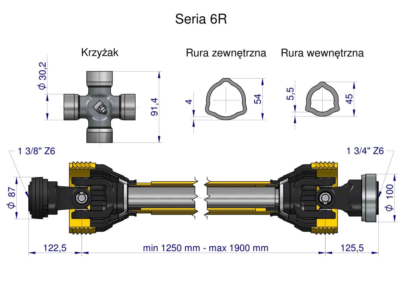 Wał przegubowo-teleskopowy 1250-1900mm 830Nm Z6 - 1 3/4 CE 2020 seria 6R Waryński