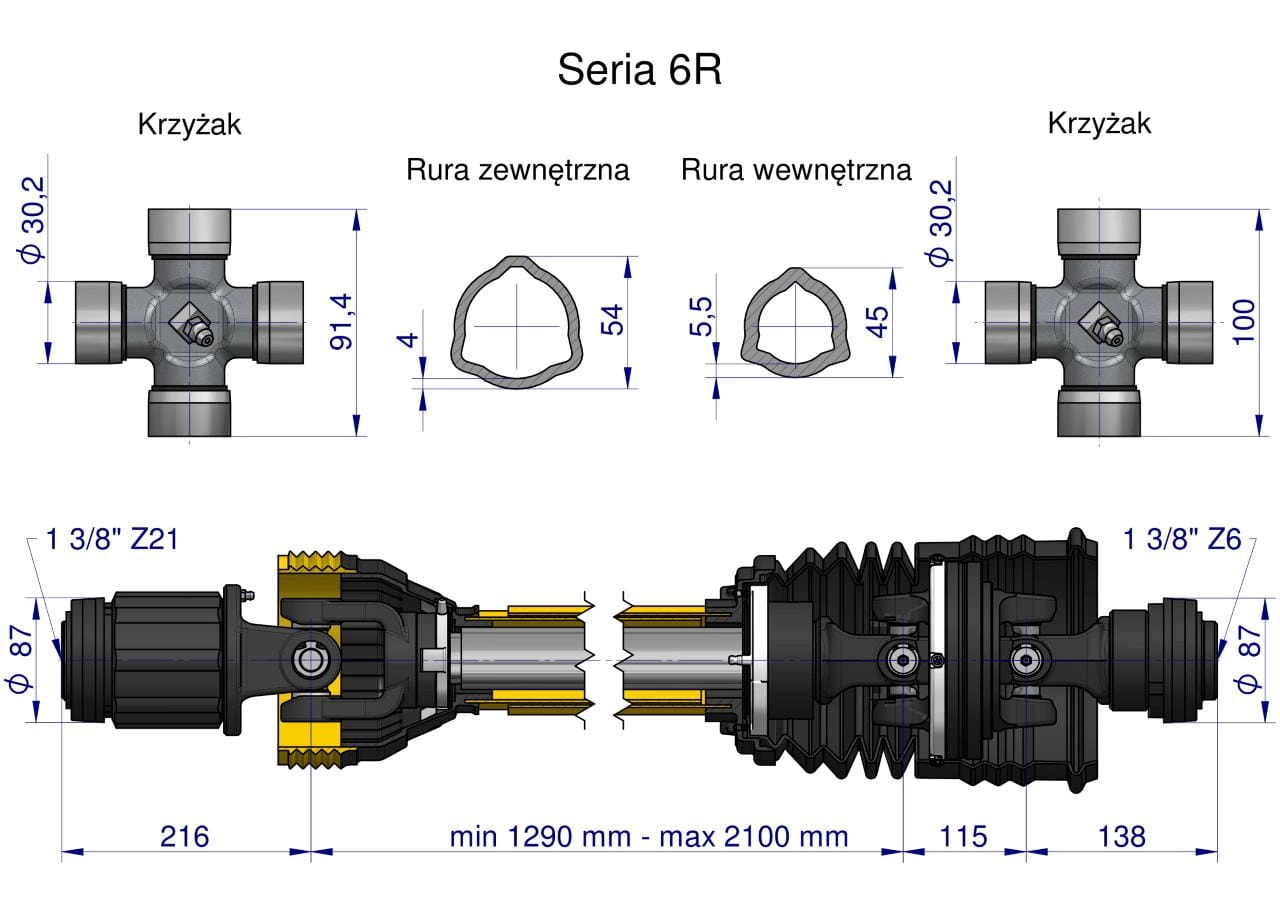Wał przegubowo-teleskopowy 1290-2100mm 830Nm sprzęgło zapadkowe 1200 Nm Z21 dr. st. szerokokątny CE 2020 seria 6R Waryński