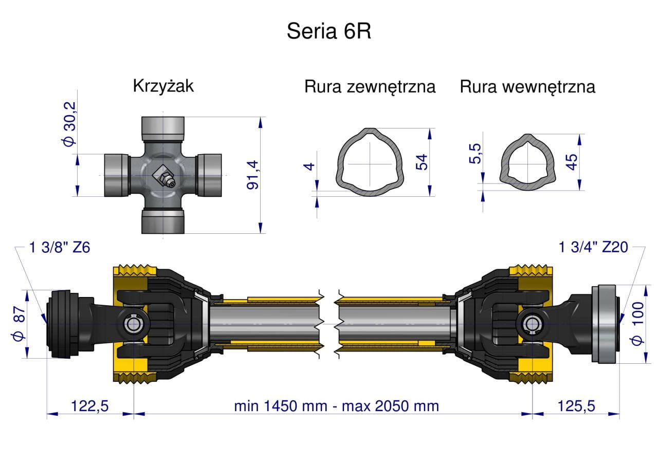 Wał przegubowo-teleskopowy 1450-2050mm 830Nm Z20 - 1 3/4 CE 2020 seria 6R Waryński