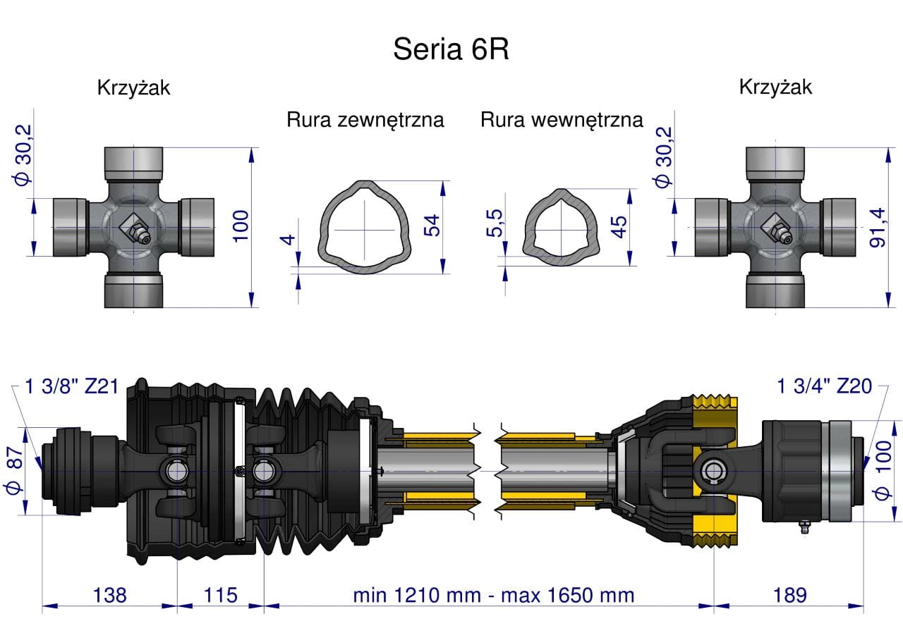 Wał przegubowo-teleskopowy 1510-2130mm 830Nm szerokokątny Z21 dr.str. sprzęgło jednokierunkowe Z20 - 1 3/4 CE 2020 seria 6R Waryński