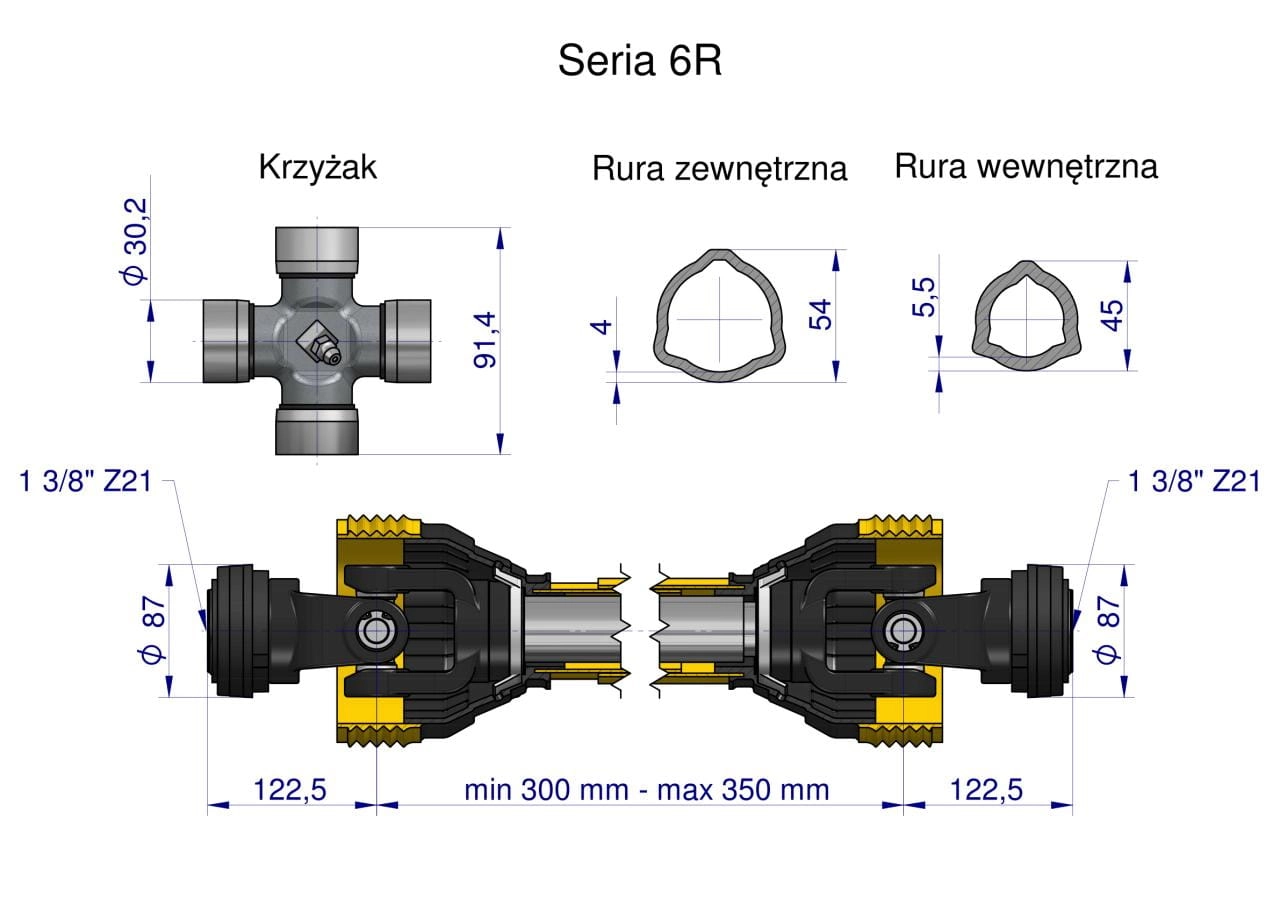 Wał przegubowo-teleskopowy 300-350mm 830Nm Z21 z dwóch stron CE 2020 seria 6R Waryński APL00126 długość 430