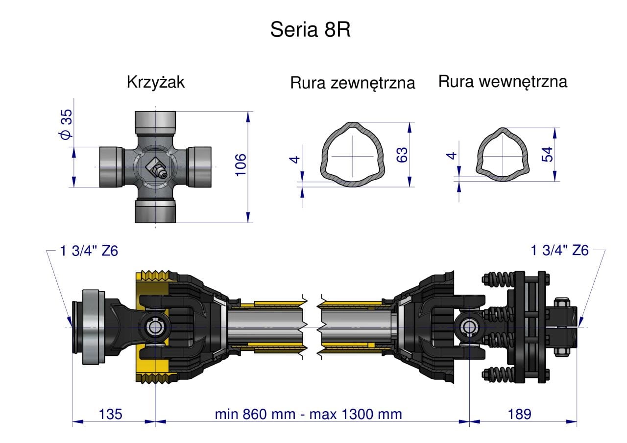 Wał przegubowo-teleskopowy 860-1300mm 1240Nm Z6 - 1 3/4 z drugiej strony sprzęgło cierne 1700Nm Z6 - 1 3/4 CE CE 2020 seria 8R Waryński