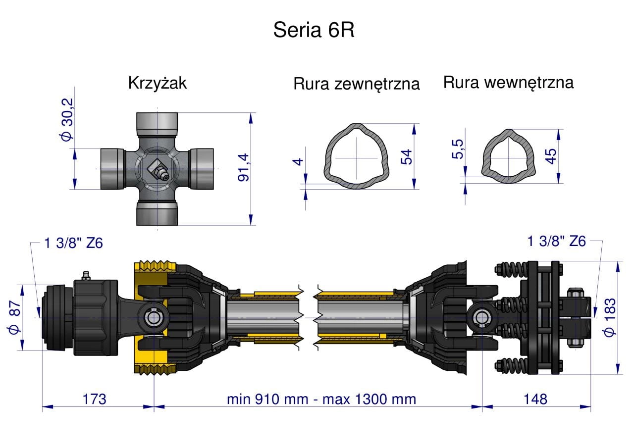 Wał przegubowo-teleskopowy 910-1300mm 830Nm sprzęgło cierne 1200Nm z drugiej stron sprzęgło jednokierunkowe CE 2020 seria 6R Waryński