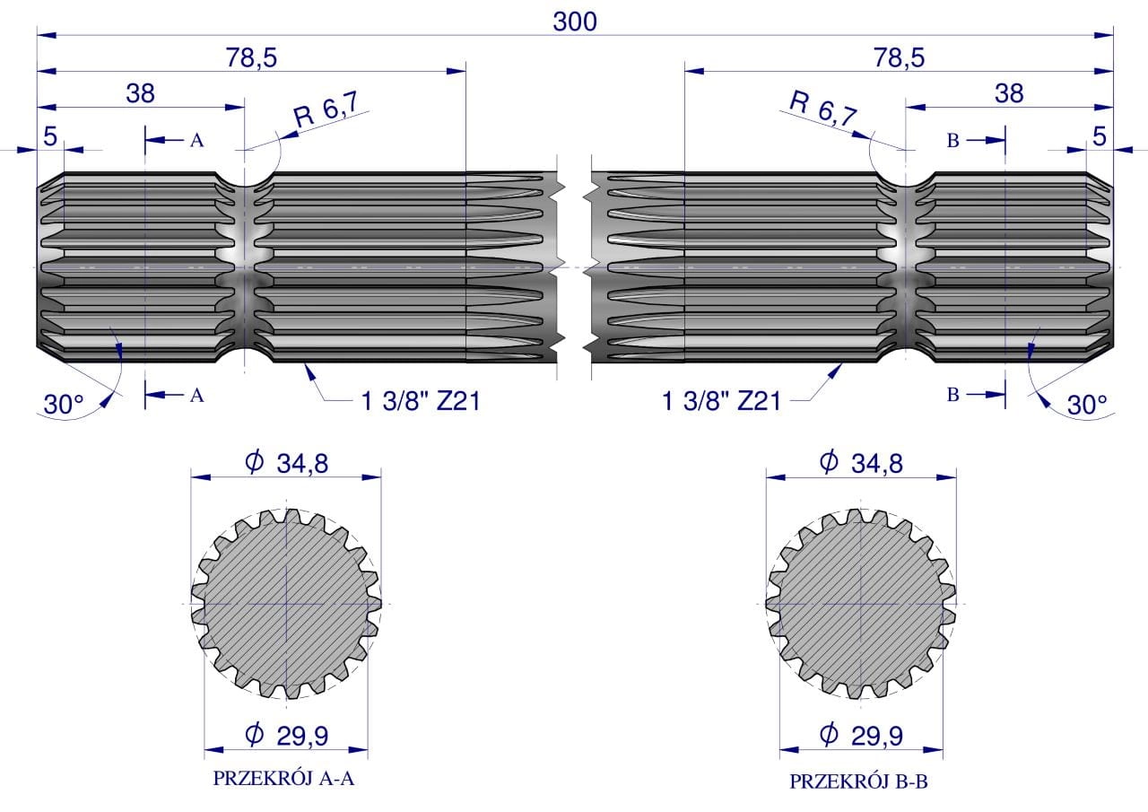 Wałek, WOM frezowany dwustronnie 300mm Z21 - 1 3/8, Waryński