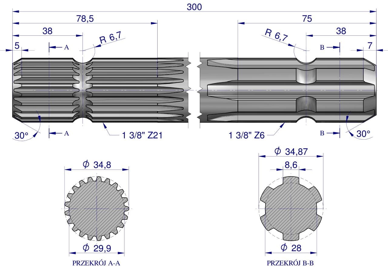 Wałek, WOM frezowany dwustronnie 300mm Z21 - 1 3/8 na Z6 - 1 3/8, Waryński