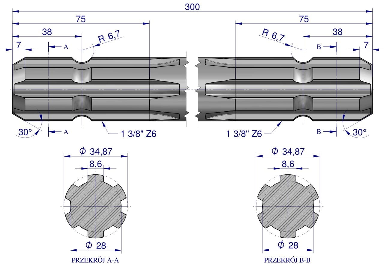 Wałek, WOM frezowany dwustronnie 300mm Z6 - 1 3/8, Waryński